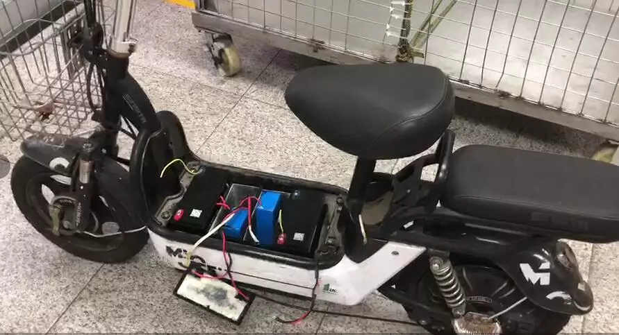 “當(dāng)時看到這名旅客電單車的腳踏板位置比車身其他位置要干凈一些、新一些,就進(jìn)行了檢查。檢查發(fā)現(xiàn)腳踏板可以直接掀起來,里面的電池盒外表也比較新,這就不太正常了?!爆F(xiàn)場關(guān)員介紹道。隨后,關(guān)員對電動單車電池盒進(jìn)行了拆卸。