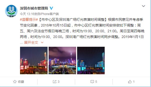 近期,深圳燈光秀表演刷屏朋友圈。今天(10月14日)13時,深圳市城市管理局發(fā)布通知稱,根據市民意見并考慮季節(jié)變化因素,10月15日起,深圳市中心區(qū)及深圳灣廣場燈光表演時間調整。