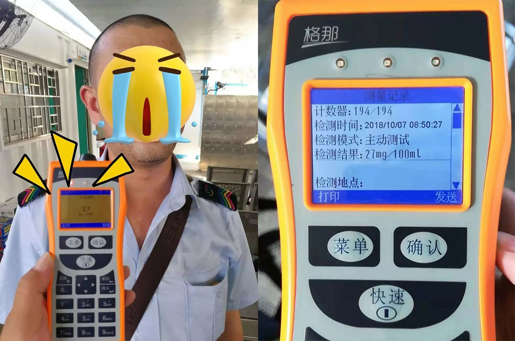 深圳交警到達現(xiàn)場后,再對何某平進行現(xiàn)場主動式酒精測試儀檢測,結果顯示其酒精測試值顯示為27mg/100ml,達到酒后駕駛的標準。