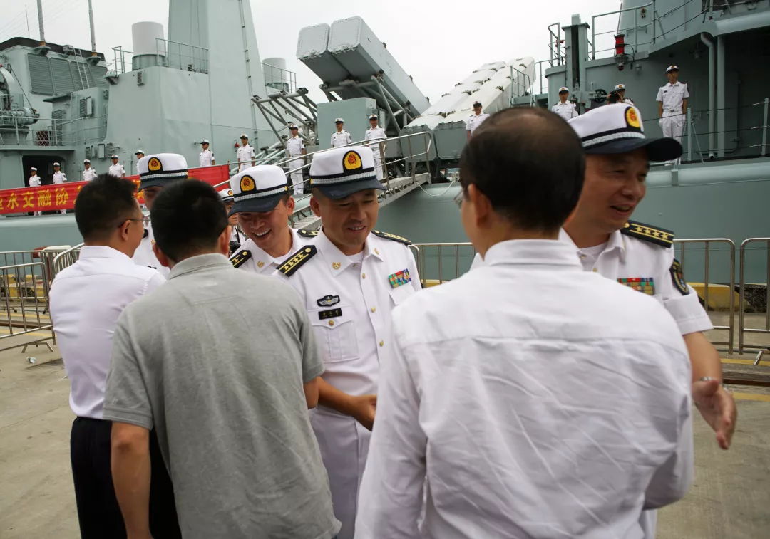 深圳市委副秘書長劉平生,市民政局局長廖遠飛,南山區(qū)委常委、宣傳部部長廖子彬,南山區(qū)委常委、人武部部長彭耀玖,副區(qū)長謝炳文等領(lǐng)導代表市、區(qū)雙擁辦在碼頭上歡送深圳艦。南部戰(zhàn)區(qū)海軍副參謀長李曉巖少將,深圳艦所在某驅(qū)逐艦支隊副政委蔣軍大校,深圳艦艦長黃北奇大校,深圳艦政委陳永強上校等與深圳親人一一握手道別。