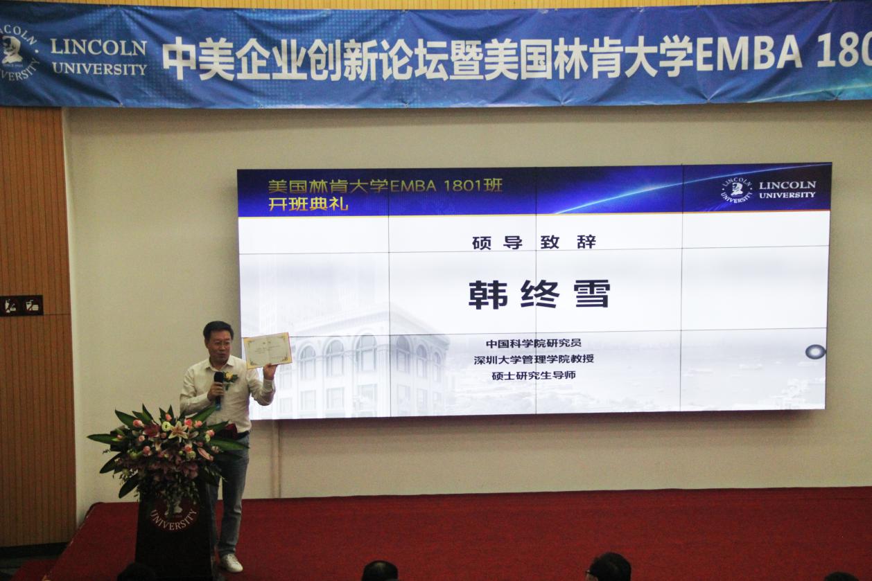 深圳新聞網(wǎng)訊 10月27日上午,由美國(guó)林肯大學(xué)EMBA深圳教學(xué)中心舉辦的《中美企業(yè)創(chuàng)新論壇》暨美國(guó)林肯大學(xué)EMBA1801班開(kāi)班典禮,在深圳科技園香港科技大學(xué)報(bào)告廳舉行。論壇邀請(qǐng)了美國(guó)林肯大學(xué)校方代表?xiàng)畛缢嚥┦?、方勝祥先生、美?guó)加州州立大學(xué)計(jì)算機(jī)系正教授 陶翼青 、中科院研究員韓終雪教授出席。美國(guó)林肯大學(xué)EMBA1801班的同學(xué)們、來(lái)自深圳教育行業(yè)、中國(guó)企業(yè)家代表 以及 媒體記者等160多位嘉賓 參加活動(dòng) 。