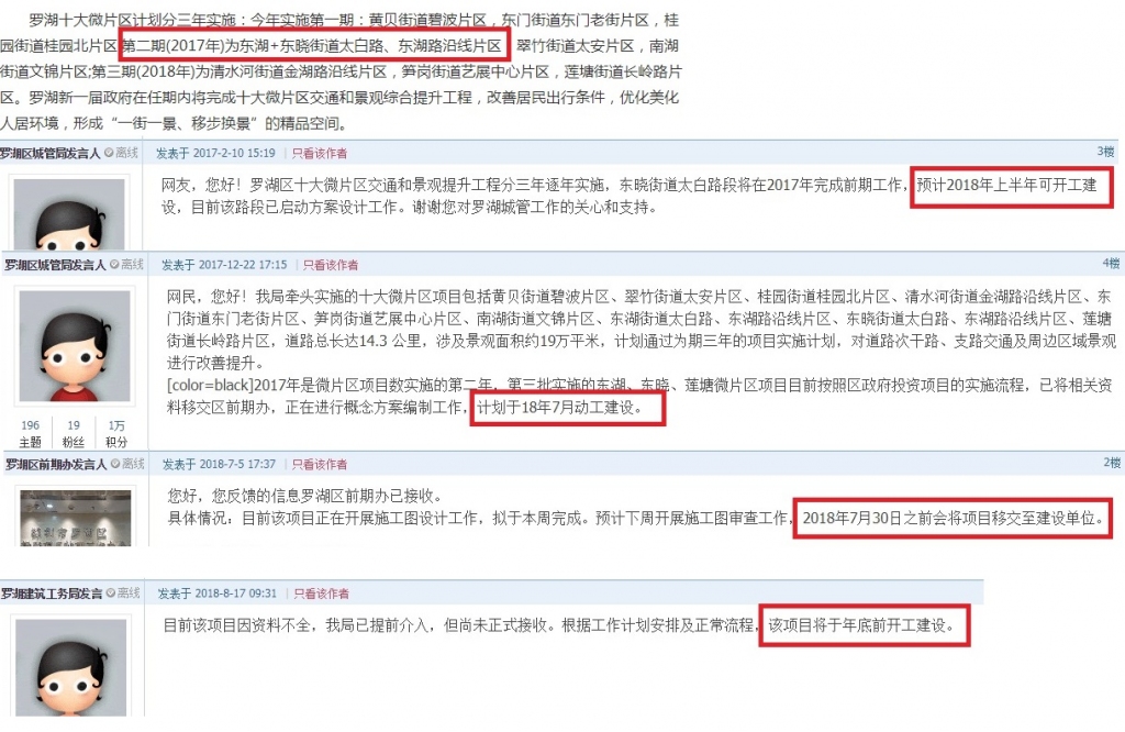 據(jù)了解,為改善居民出行條件,美化居住環(huán)境,羅湖區(qū)于2016年發(fā)布了十大微片區(qū)交通和景觀綜合提升工程計(jì)劃。該計(jì)劃表示全工程將分三年實(shí)施,而太白路-東湖路微片區(qū)屬第二期,應(yīng)于2017年開(kāi)始動(dòng)工實(shí)施。但截至2018年11月,該項(xiàng)目仍未動(dòng)工。從網(wǎng)友發(fā)布的截圖上看,一個(gè)名為“羅湖區(qū)城管局發(fā)言人”的論壇賬號(hào)分別于2017年2月、12月以及2018年7月和8月對(duì)太白路-東湖路微片區(qū)景觀提升工程延遲實(shí)施的計(jì)劃進(jìn)行了回復(fù)。而相應(yīng)的動(dòng)工日期也從2018年上半年延遲到了2018年底。