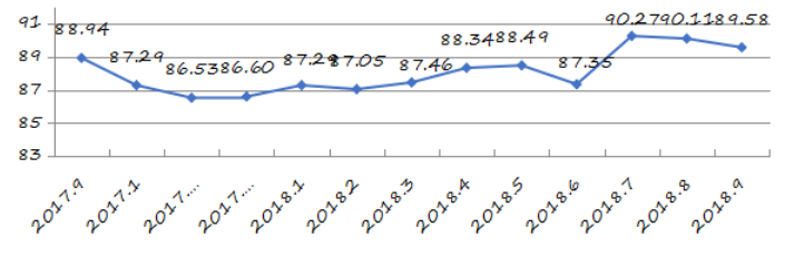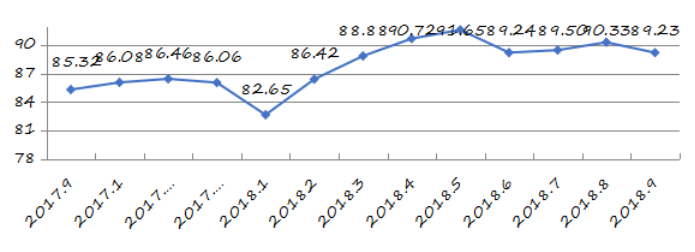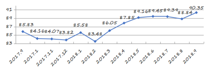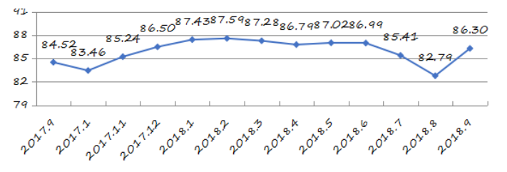 國家統(tǒng)計局深圳調查隊編制9月份深圳市城市交通文明指數(shù)為87.02分,比上月增加0.05分,比上年同期增加2.06分;深圳市城市交通文明進步指數(shù)為-0.05 % (見圖1)。