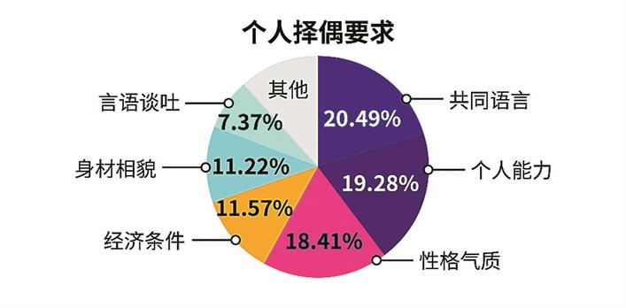調(diào)查顯示,共同語言、個人能力、性格氣質(zhì)為單身男女在擇偶時最看重的三個方面,其次為經(jīng)濟條件、身材相貌、言語談吐??梢?,相較于過去條件上的匹配,更重視精神上的契合。
