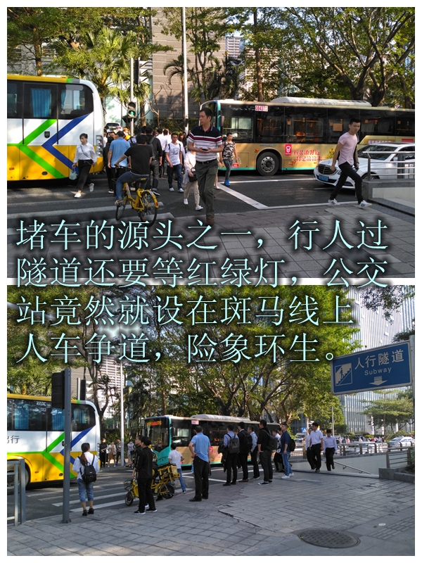而在進(jìn)入人行隧道前,又需要等紅綠燈,且公交車站就設(shè)在這紅綠燈前的斑馬線上?!拔也幻靼诪楹卧诮煌ㄟ@樣混亂的地方,要設(shè)置公交車站,也不知為何‘為難’的都是市民?!本W(wǎng)友“深圳大胡子”為這里每天通行的行人鳴不平,他希望能把招商銀行公交站原來(lái)的港灣式站臺(tái)恢復(fù),方便市民乘車,也希望能盡快恢復(fù)正常的過(guò)街通道。