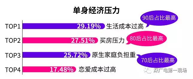 脫單難點中的經(jīng)濟壓力層面分析發(fā)現(xiàn),生活成本過高是影響脫單的最大單身壓力,其次是買房壓力,原生家庭負擔(dān)重以及戀愛成本過高。
