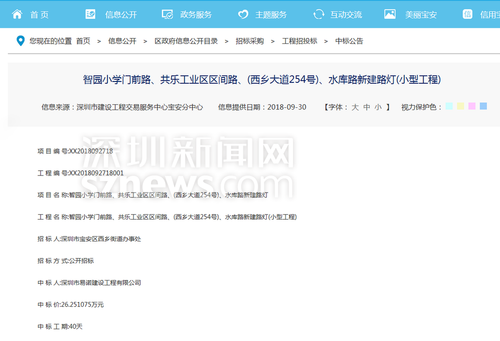 記者從寶安西鄉(xiāng)街道官網(wǎng)中標公告獲悉,智園小學(xué)門前路工程施工中標單位是深圳市易諾建設(shè)工程有限公司,中標工期是40天。據(jù)招標公告顯示計劃開竣工時間是2018年10月08日至2018年11月18日。網(wǎng)友希望施工能夠如期完工,道路能夠早日恢復(fù)暢通,施工期間,最好能夠?qū)⑹┕龅睾腿诵械栏糸_,確保學(xué)生人身安全。