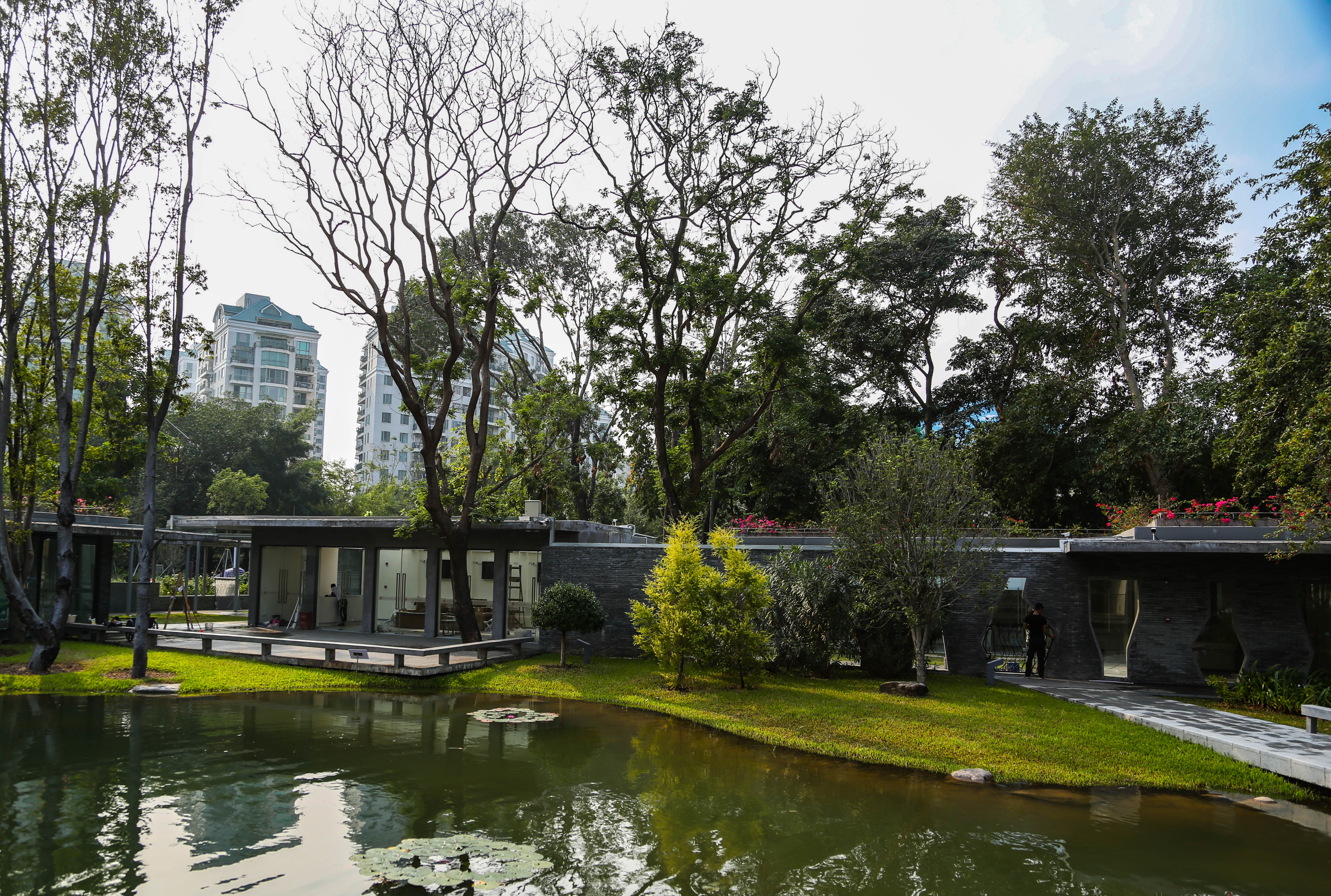 站在中式禮堂看對(duì)岸的福田區(qū)民政局婚姻登記中心叫號(hào)大廳。