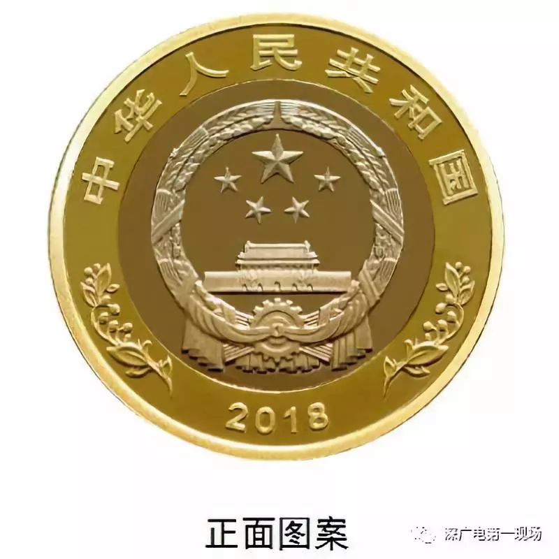 雙色銅合金紀(jì)念幣正面圖案為國徽,國徽上方刊“中華人民共和國”國名,下方刊年號“2018”字樣,左右兩側(cè)為果實圖案。
