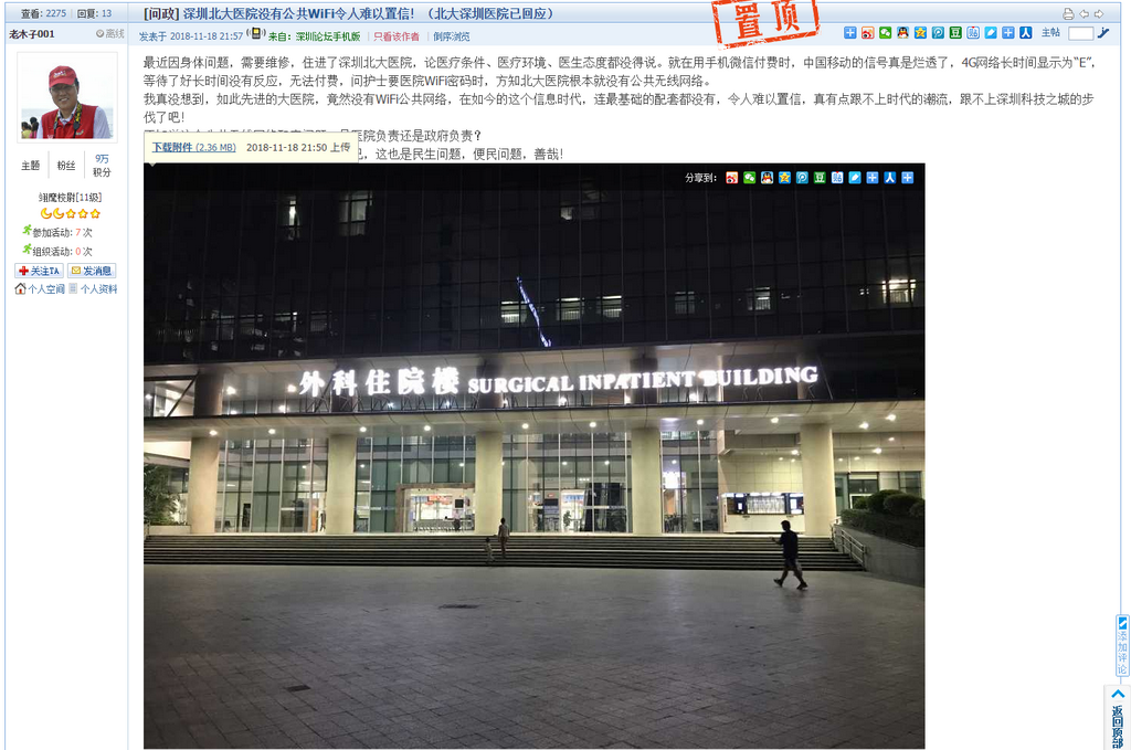 網(wǎng)友“老木子001”稱,其因身體問(wèn)題到北大深圳醫(yī)院住院,在準(zhǔn)備用微信付費(fèi)時(shí),發(fā)現(xiàn)手機(jī)4G網(wǎng)絡(luò)長(zhǎng)時(shí)間顯示為“E”,無(wú)法付費(fèi)。網(wǎng)友找護(hù)士詢問(wèn)醫(yī)院WiFi密碼時(shí),被告知北大深圳醫(yī)院沒(méi)有公共無(wú)線網(wǎng)絡(luò)。