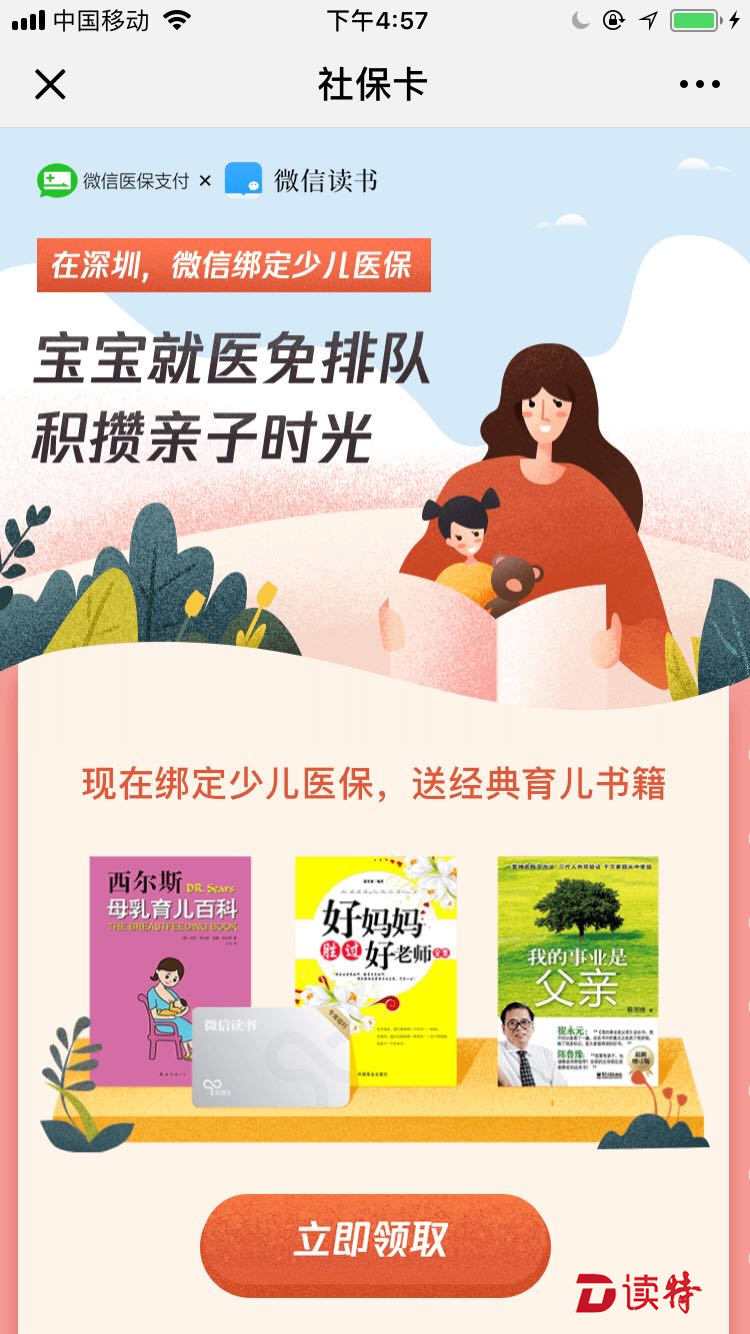 深圳特區(qū)報(bào)2018年11月21日訊 作為微信醫(yī)保支付的試點(diǎn)城市,深圳又開通便民新服務(wù),全國(guó)內(nèi)率先開通微信綁定少兒社???,支持少兒醫(yī)保線上支付服務(wù)。記者獲悉,11月20日起,父母在微信綁定孩子的少兒社保卡,就可以用微信上通過醫(yī)保給孩子繳納掛號(hào)、就診費(fèi)用,省去排隊(duì)煩惱。此外,20日起,用戶在微信綁定少兒社??ǎ擅赓M(fèi)領(lǐng)取微信讀書三本經(jīng)典育兒書籍和3天無限閱讀卡兌換碼。