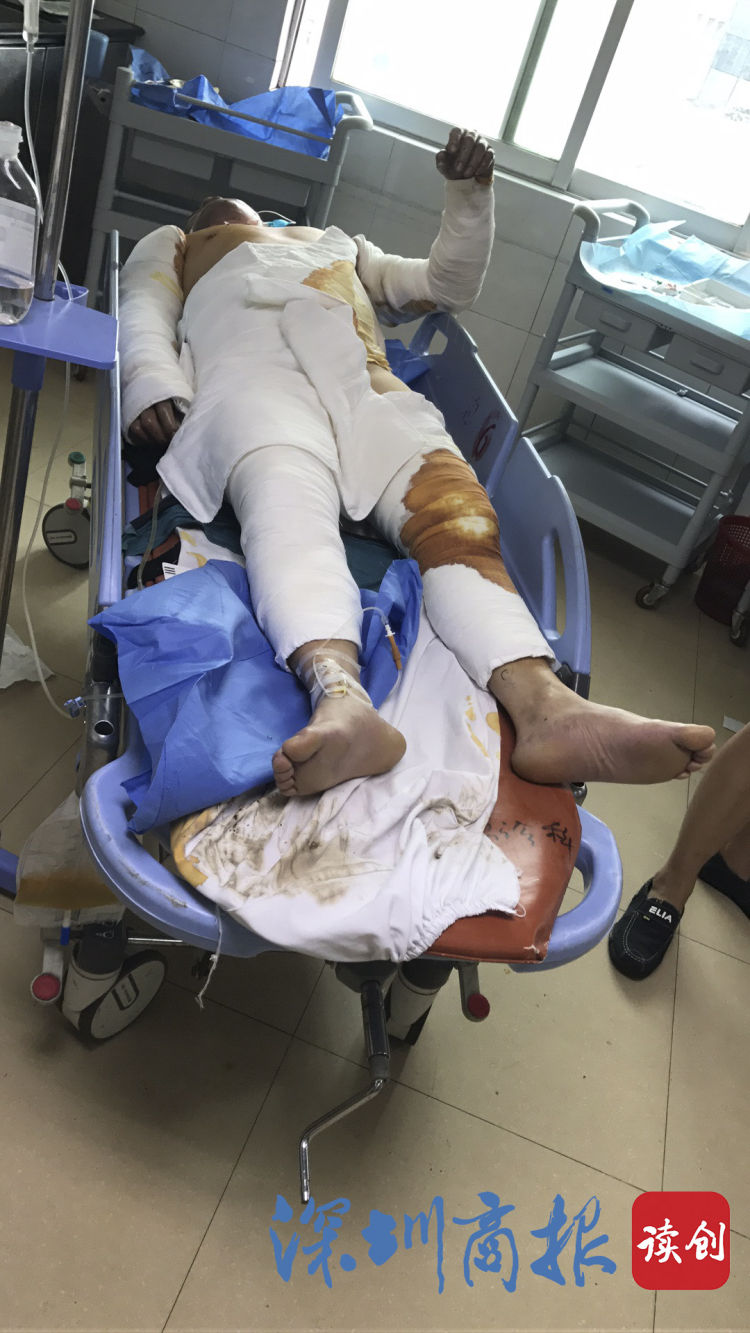 附近鄰居聞訊趕來,拿起滅火器幫忙滅火?!八麄儍蓚€人渾身都是火,是爬著出來的。”高朝雄的妻子洪女士至今不敢相信自己看到了這突如其來的一幕?;馂?zāi)發(fā)生后,兩人被送往醫(yī)院。經(jīng)醫(yī)生診斷,兩個人身上多處被熱油火焰燒傷,燒傷面積達(dá)50%,高朝雄呼吸道和雙眼均被燒傷。高朝雄表弟肖輝廷告訴記者,目前兩個人都在深圳市第二人民醫(yī)院就醫(yī)治,仍沒有脫離危險。