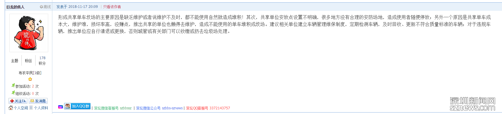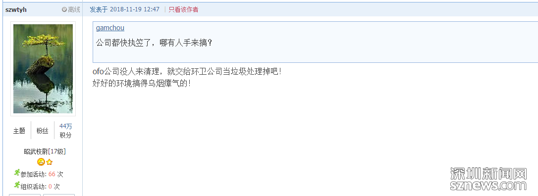 “福田河的水質很好,但大量的故障單車停放在路邊實在是煞風景?!本W友“szwtyh”認為,不應該讓這些單車礙了深圳的城市景觀,掃了市民欣賞福田河水的興致。