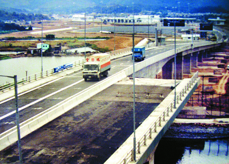 1989年12月26日,皇崗口岸開通時的第一輛入境貨柜車,當(dāng)時落馬洲大橋只建成一半。 黃國春 攝