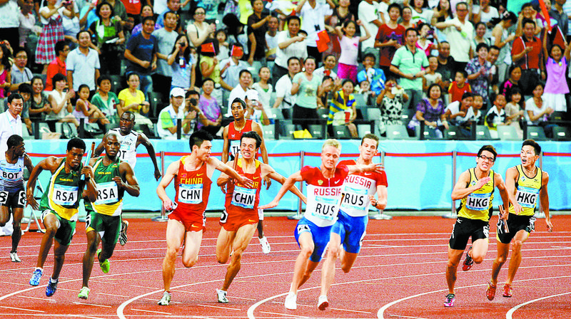 大運會中,深圳健兒男子4X100米接力賽上創(chuàng)佳績。鄭東升 攝