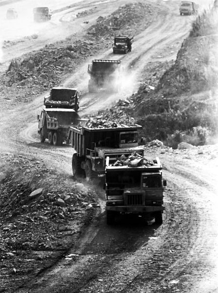 1994年,修建濱海大道時泥頭車運(yùn)泥填海。鄭東升 攝