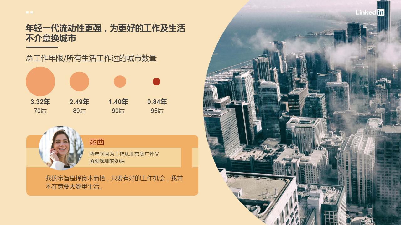 在此前的調(diào)研中,領(lǐng)英數(shù)據(jù)顯示90/95后年輕職場人的平均在職時(shí)間顯著降低,為了追求更好的工作機(jī)會(huì)他們不介意頻繁跳槽。而這樣的高流動(dòng)性同樣也體現(xiàn)在城市的變動(dòng)上。以職場人總工作年限/所有生活工作過的城市數(shù)量為衡量依據(jù),領(lǐng)英大數(shù)據(jù)顯示:職場人城市間流動(dòng)頻率,呈現(xiàn)出隨年齡的降低而增高的趨勢,年輕一代在城市方面的流動(dòng)性越來越強(qiáng)。