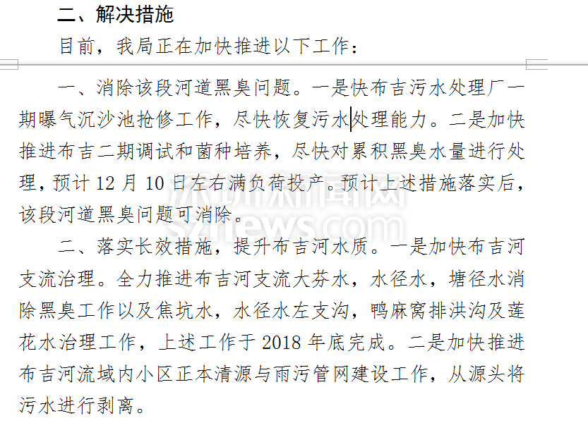 針對上述疑問,龍崗區(qū)環(huán)水局承諾將抓緊推進布吉污水處理廠一期曝氣沉沙池搶修工作,盡快恢復污水處理能力,而二期工程也預計于12月10日左右滿負荷投產(chǎn),以上措施落實后,該環(huán)水局認為此段河道黑臭問題便可消除。為了保障治水工作長期有效,環(huán)水局還制定了加快布吉河支流治理及加快推進布吉河流域內(nèi)小區(qū)正本清源與雨污管網(wǎng)建設工作的計劃。