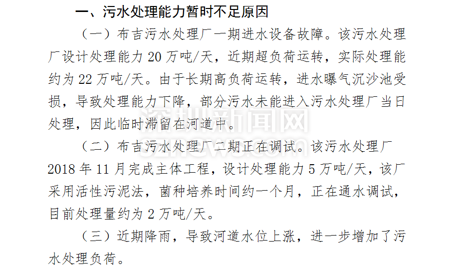 在其復函中,明確說明了河道黑臭的原因主要為該片區(qū)污水處理能力暫時不足(片區(qū)污水產(chǎn)生量約為26萬噸/天,目前實際污水處理量約為24萬噸/天),為防止生活污水直排下游,臨時設置橡膠壩,生活污水臨時滯留河道所致。