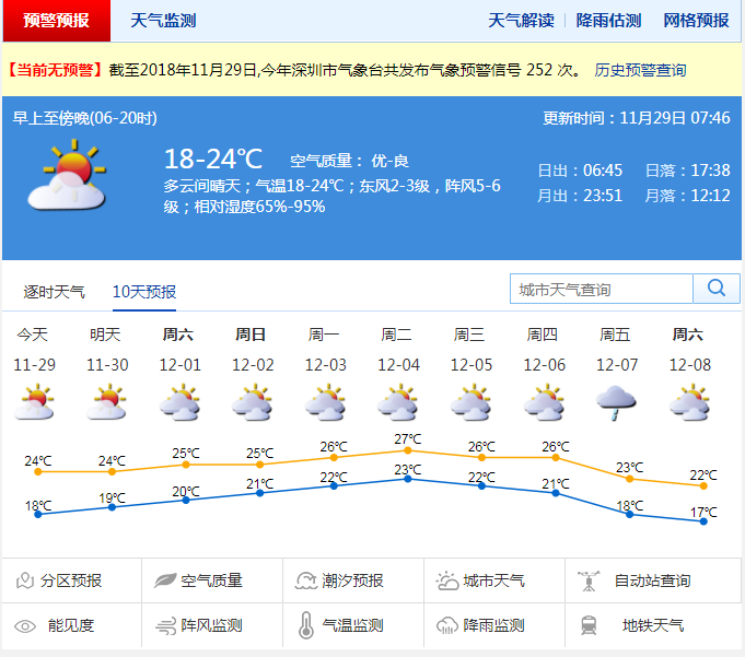 11月29日深圳最高氣溫24°,多云間晴天;氣溫18-24℃;東風(fēng)2-3級,陣風(fēng)5-6級;相對濕度65%-95%