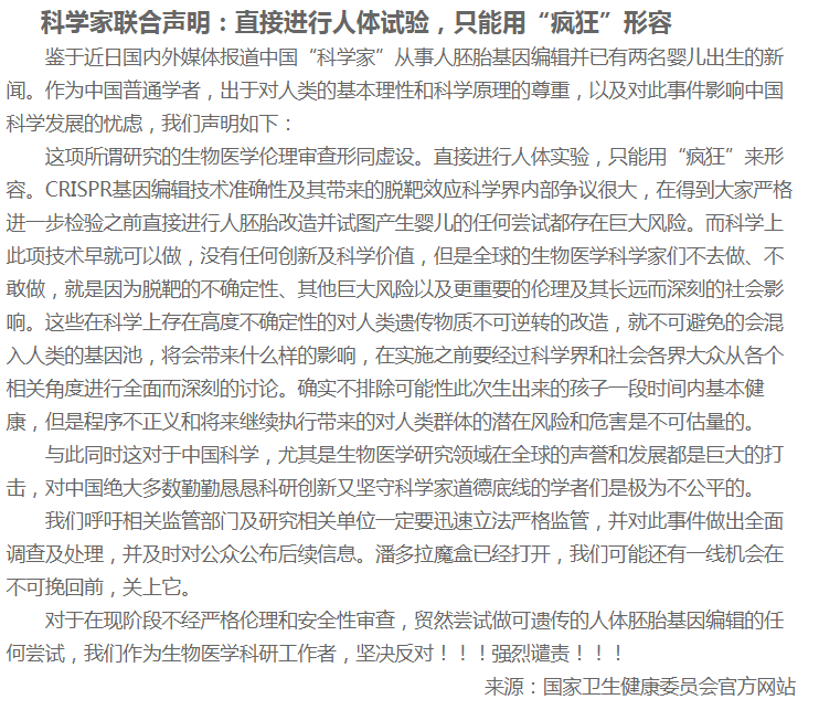 據(jù)了解,事情的起因是賀建奎在第二屆國(guó)際人類(lèi)基因組編輯峰會(huì)召開(kāi)前一天宣布,一對(duì)名為露露和娜娜的基因編輯嬰兒于11月在中國(guó)誕生。