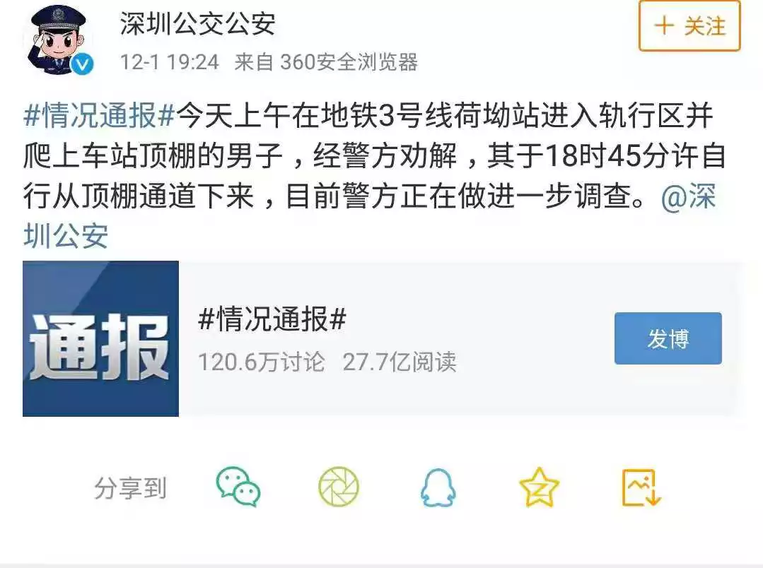 昨晚(12月1日)18點45分左右,爬上深圳地鐵3號線荷坳站頂棚的男子被成功勸下來。該男子早上8點多翻越屏蔽門爬上站頂,導致地鐵3號線部分運行區(qū)間延誤,荷坳站暫停運營。
