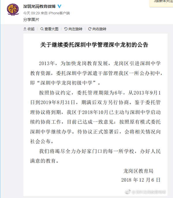 據(jù)了解,從11月底開始,深圳中學將撤離龍崗的消息就在網(wǎng)絡(luò)上不脛而走,學區(qū)內(nèi)的業(yè)主在得知這個消息后,有些不知所措,紛紛通過各種渠道打聽消息,有些業(yè)主直接找到龍崗區(qū)教育局求證。12月6日,深圳龍崗教育官方微博發(fā)布公告,目前已達成一致意見:按照原有模式委托深圳中學繼續(xù)辦學。