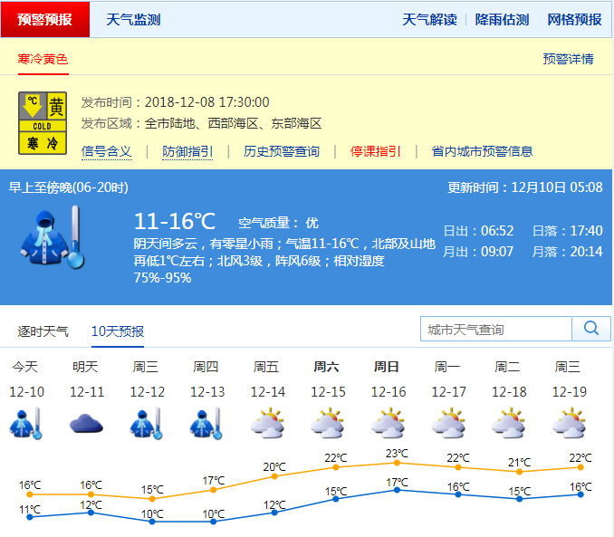 深圳新聞網(wǎng)12月10日訊(記者 施冰冰)據(jù)了解,受冷空氣補(bǔ)充影響,深圳10日陰天間多云,偶有零星小雨,早晨最低氣溫10-11℃,天氣陰冷;11日云量較多,日溫差??;12-13日新一股冷空氣影響,多云可見陽光,最低氣溫將降至10℃或以下;14日冷空氣減弱,氣溫回升。預(yù)計(jì)寒冷黃色預(yù)警信號(hào)將持續(xù)至13日前后。