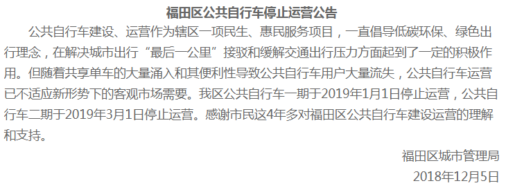 2019年起,福田區(qū)公共自行車將停運