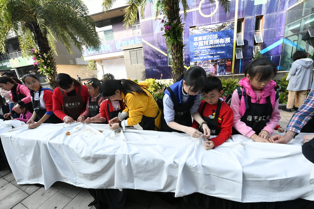 開(kāi)幕式過(guò)后,一場(chǎng)數(shù)百人的非遺藍(lán)染造物派對(duì)在觀瀾湖藝工場(chǎng)文創(chuàng)大道精彩上演。深圳大學(xué)教授、草木藍(lán)兮創(chuàng)始人羅瑩女士帶領(lǐng)大家集體創(chuàng)作“鵬城之藍(lán)”,在參與者體驗(yàn)造物樂(lè)趣的同時(shí),也讓傳統(tǒng)手工技藝煥發(fā)新風(fēng)采;從貴州畢節(jié)、黔南遠(yuǎn)道而來(lái)的繡娘、非遺傳承人染娘和手工藝?yán)蠋焸?,現(xiàn)場(chǎng)展現(xiàn)了代代相傳的中華植物染工藝;以臺(tái)風(fēng)“山竹”為題材的“芳華”造蟻行動(dòng),通過(guò)使用臺(tái)風(fēng)損毀下來(lái)的樹(shù)枝進(jìn)行再創(chuàng)作,喚起大眾對(duì)自然的敬畏和環(huán)保意識(shí);百人勒杜鵑紙藝花的創(chuàng)作,更是精彩非凡,為改革開(kāi)放最前沿的深圳獻(xiàn)禮。期間大量市民及游客參與到手工造物的體驗(yàn)中,人人迸發(fā)出巧思和匠心,體現(xiàn)出潛移默化的文化傳承。