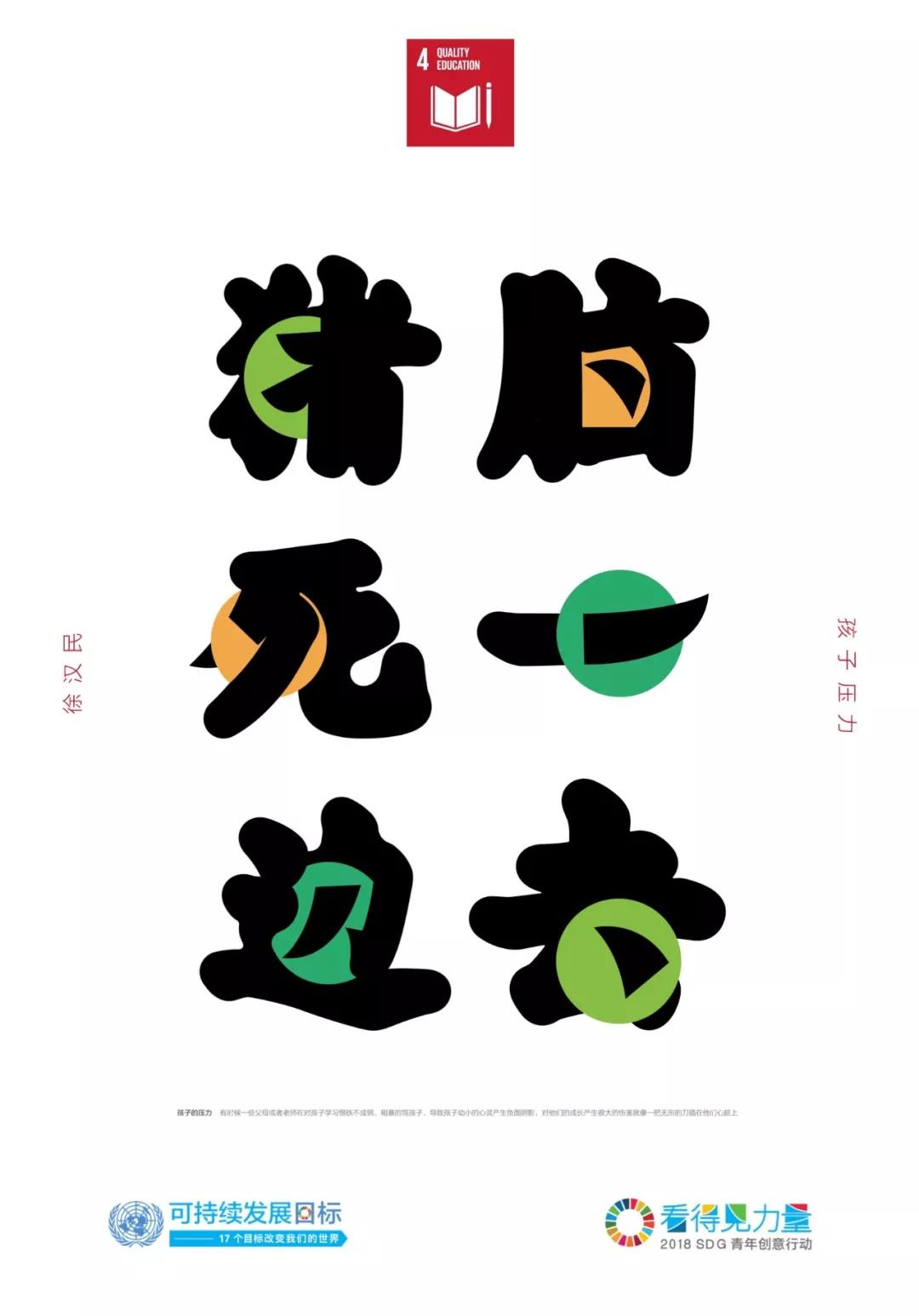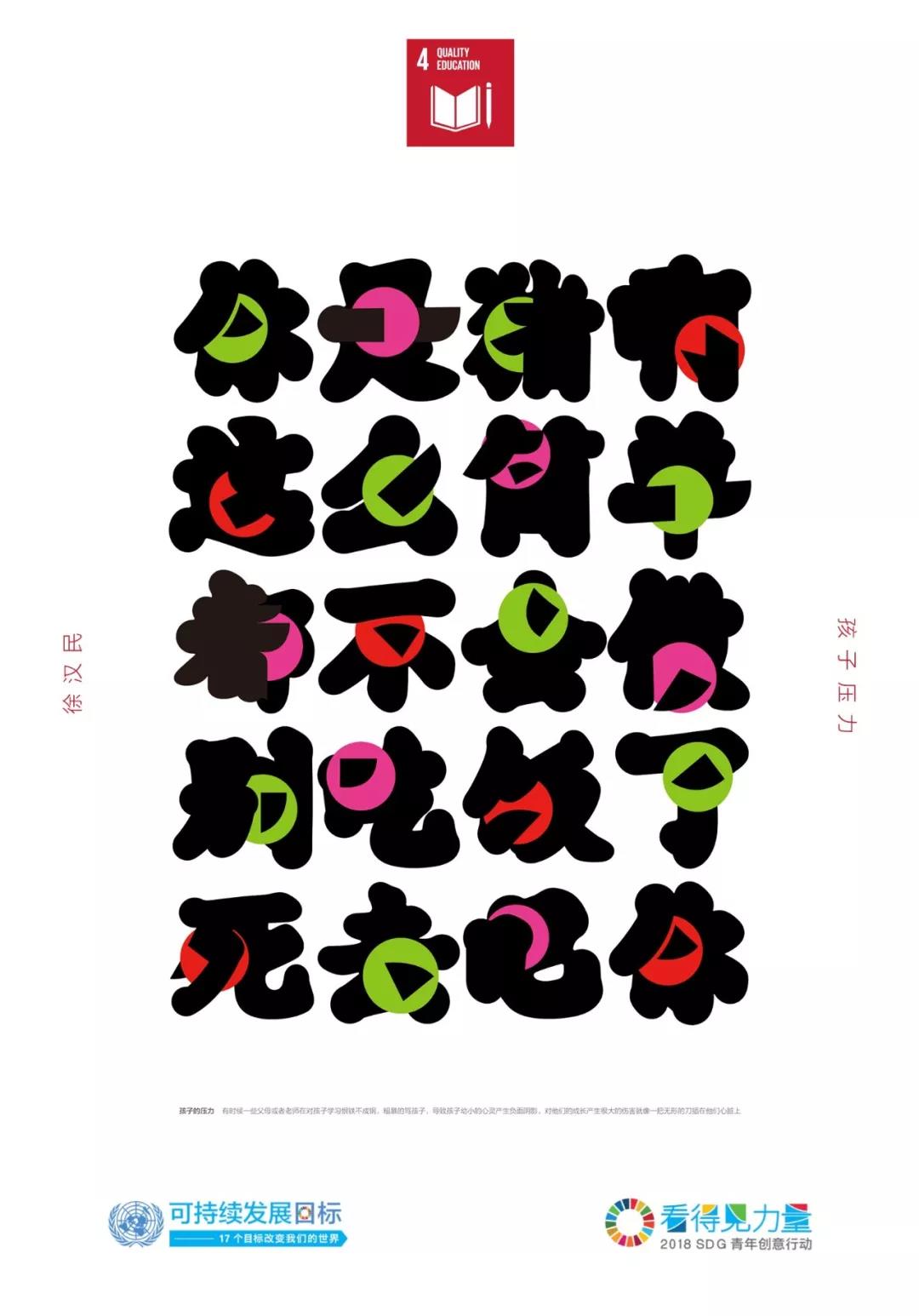 作品解釋 /現(xiàn)在孩子的壓力越來越大,導(dǎo)致很多孩子心理灰暗、暴力犯罪、自我封閉等現(xiàn)象,其中一個原因是父母期望和恨鐵不成鋼打罵給孩子帶來沉重的壓力。由此作者直接用那些語句來設(shè)計,這些字體中穿插著一個小圓點即孩子們的腦袋,他們被這些語言帶來的無形壓力刺痛,整個字比較圓潤只有關(guān)鍵的地方鋒利無比,就像一把無形的刀插在他們心上。