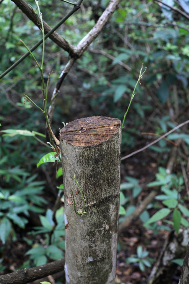 12月24日上午,記者再次來到首次發(fā)現(xiàn)盜采土沉香的地點(diǎn)。經(jīng)過近兩個小時(shí)的搜尋,在東北側(cè)山坡和溪谷中,又接連發(fā)現(xiàn)了6棵被盜伐的疑似野生土沉香。記者隨即將情況向仙湖植物園管理處副主任、植物專家張壽洲博士通報(bào)了情況,張博士告訴記者,管理處會盡快勘查現(xiàn)場,對被破壞的土沉香進(jìn)行處理。"通常情況下,被鋸斷的土沉香不會死亡,我們會根據(jù)實(shí)際情況對受損的植株采取相應(yīng)的保護(hù)措施。另外,我們會用水泥、油漆對土沉香被盜采盜伐的斷面進(jìn)行封閉處理,讓不法分子盜采不到香料。"張博士說。