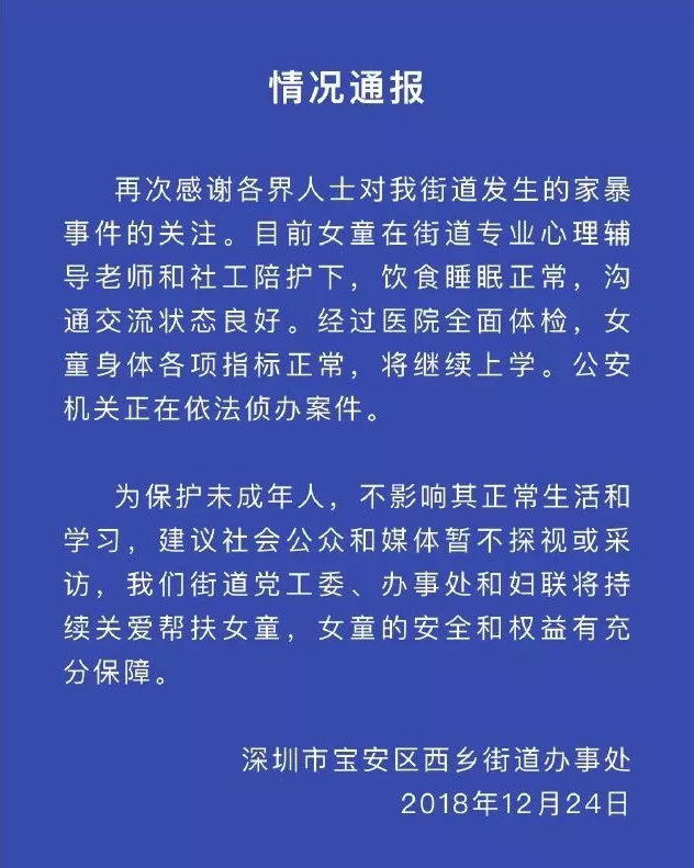 12月24日晚上,深圳市寶安區(qū)委宣傳部官方微博@陽光寶安再次發(fā)布通告,稱女童目前飲食睡眠正常,將繼續(xù)上學(xué)。公安機關(guān)正在依法偵辦案件。
