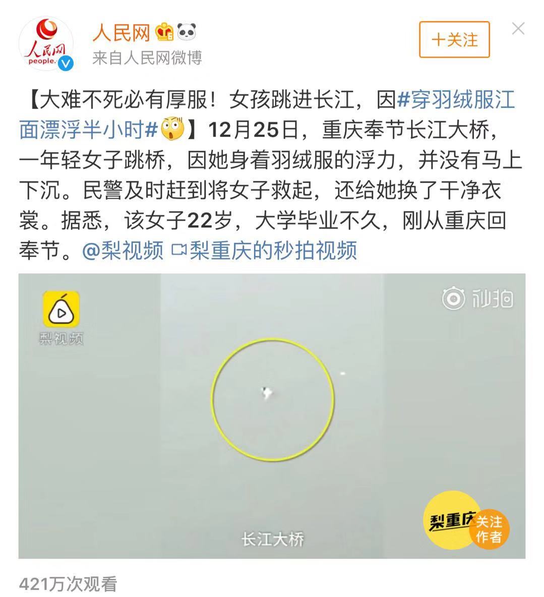 重慶有個(gè)22歲的姑娘跳長(zhǎng)江尋短見,因身上羽絨服的浮力在江上漂浮了近半小時(shí)