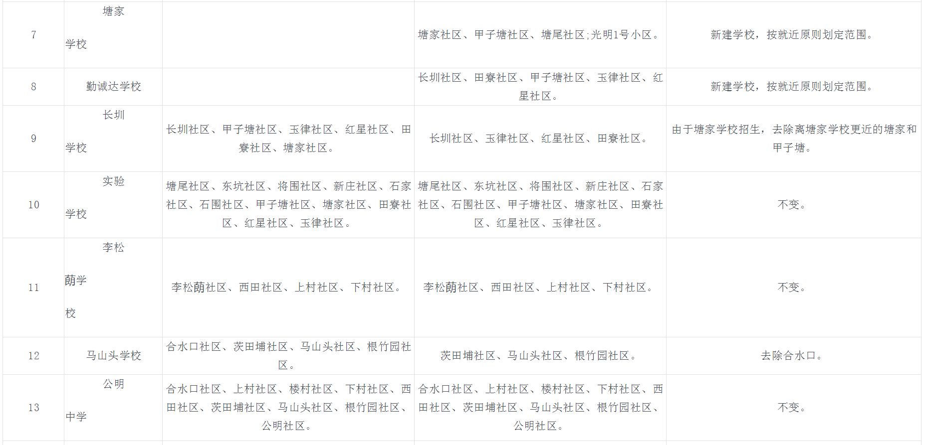 據(jù)悉,2019年光明區(qū)招生原則是原有學(xué)校招生范圍盡量保持不變,新增學(xué)校招生范圍根據(jù)招生規(guī)模、生源情況等按就近原則劃定。由于增加了勤誠達(dá)學(xué)校、信宏城小學(xué)、新城學(xué)校、塘家學(xué)校、白花學(xué)校等5所新建學(xué)校,鳳凰學(xué)校擴(kuò)建項(xiàng)目也已完成,因此,招生片區(qū)擬做調(diào)整為:白花社區(qū)不再安排至光明中學(xué);光明外國語學(xué)校招生去除田寮、長圳、甲子塘片區(qū);光明1號(hào)小區(qū)劃歸較近的塘家學(xué)校和鳳凰學(xué)校招生;馬山頭學(xué)校招生去除合水口片區(qū);光明第二中學(xué)招生去除相對(duì)較遠(yuǎn)的塘尾片區(qū)。公明二小、下村小學(xué)招生去除相對(duì)較遠(yuǎn)的公明社區(qū);長圳學(xué)校招生去除相對(duì)較遠(yuǎn)的塘家社區(qū)、甲子塘社區(qū)。鳳凰學(xué)校招生去除白花,增加光明社區(qū)。