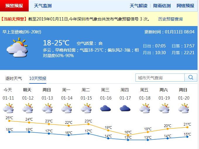 ?記者從深圳市氣象局了解到,11日陰天,早晚有輕霧,氣溫17-22℃;12-15日多云間陰天,早晚能見(jiàn)度低,可見(jiàn)陽(yáng)光,天氣平穩(wěn),氣溫小幅波動(dòng);15日夜間起受新一輪冷空氣影響,陰天伴有分散小雨,北風(fēng)加大,氣溫下降。
