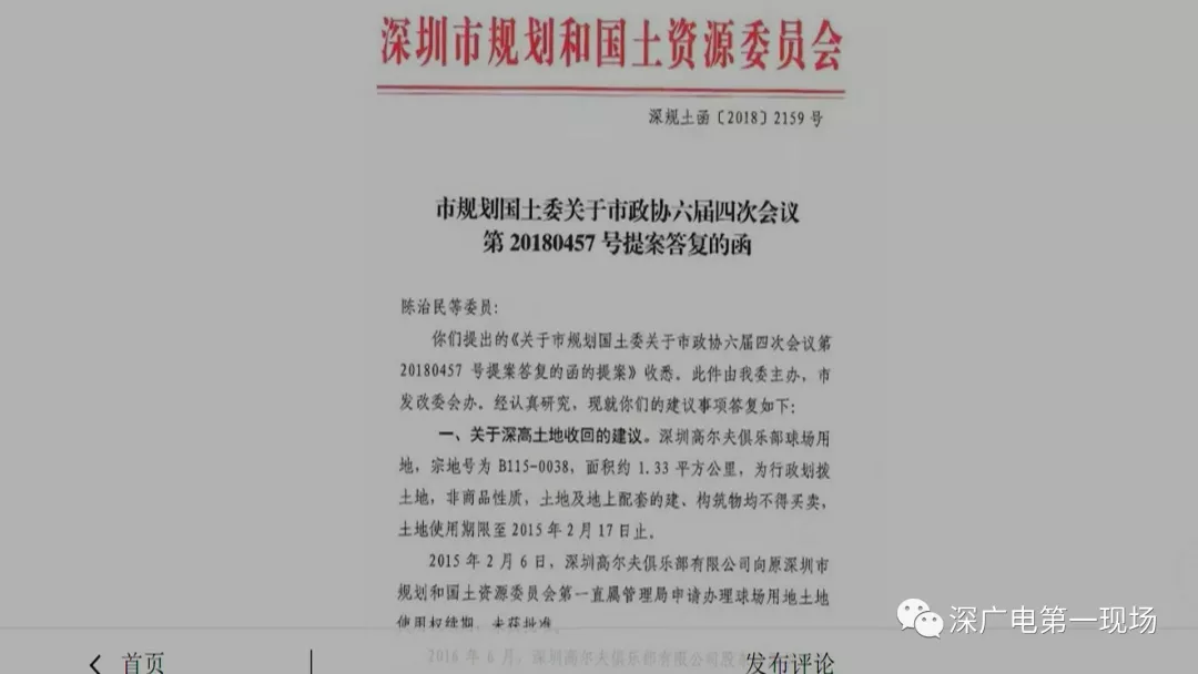 陳治民的提案,在去年獲得了深圳市規(guī)劃國(guó)土委的回復(fù),稱(chēng)目前“深高”收地工作正有序開(kāi)展中,根據(jù)相關(guān)法律法規(guī),深圳高爾夫球場(chǎng)B115-0038宗地的土地使用權(quán),將被無(wú)償收回,地上建筑物、構(gòu)筑物等將給予適當(dāng)補(bǔ)償。