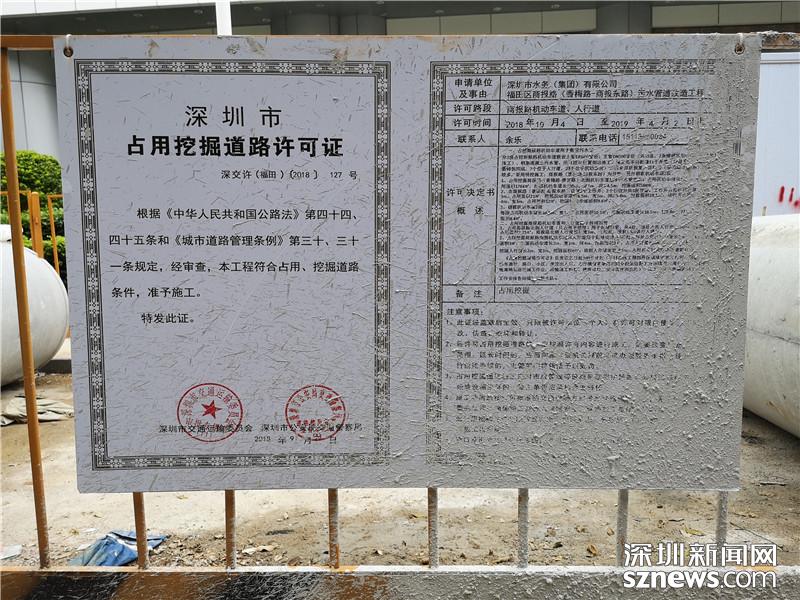 福田區(qū)商報路施工現(xiàn)場掛有”占用挖掘道路許可證“