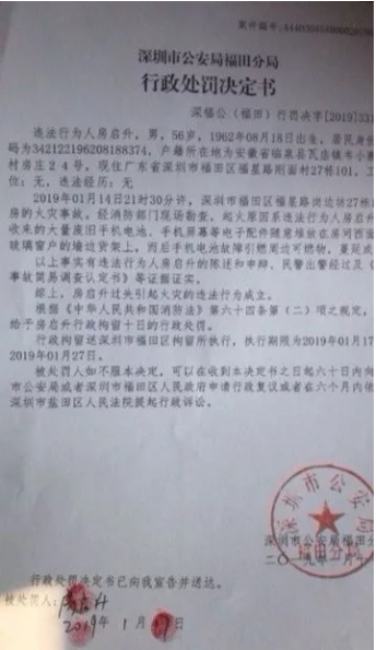 1月14日21時30分,福田區(qū)福田村崗邊坊27棟1樓發(fā)生火災(zāi)事故,因處置及時,事故未造成人員傷亡和財產(chǎn)損失。經(jīng)消防部門現(xiàn)場勘查認(rèn)定:火災(zāi)是由于違法行為人房某將回收的廢棄電池、手機(jī)屏等電子配件隨意堆放在靠窗貨架上,電池故障引燃周圍物品導(dǎo)致。福田派出所依法對房某處以行政拘留十天。