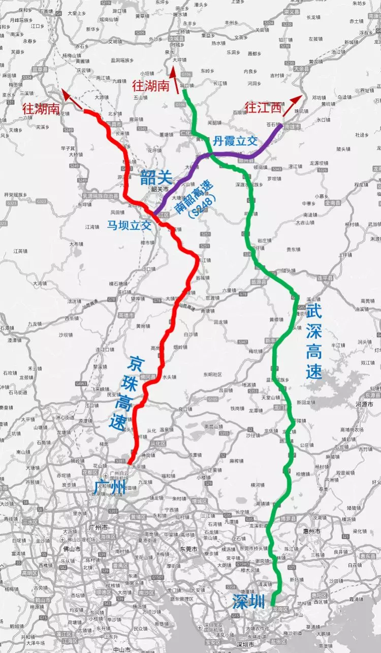 建議3:沿G4京港澳高速北上后,在韶關馬壩樞紐轉(zhuǎn)南韶高速往東,至丹霞樞紐進0入仁新高速,經(jīng)九龍江省際收費站進入湖南,沿S11平汝高速北上。該線路是前往長株潭城市群、武漢、南昌等地的最佳路徑。