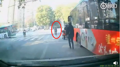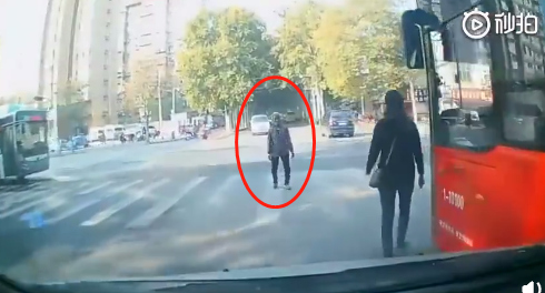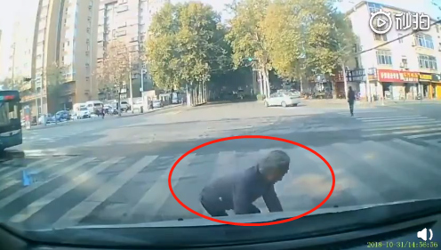 老太太走到小車正前方時卻突然停下腳步,緊接著緩緩臥倒在地。