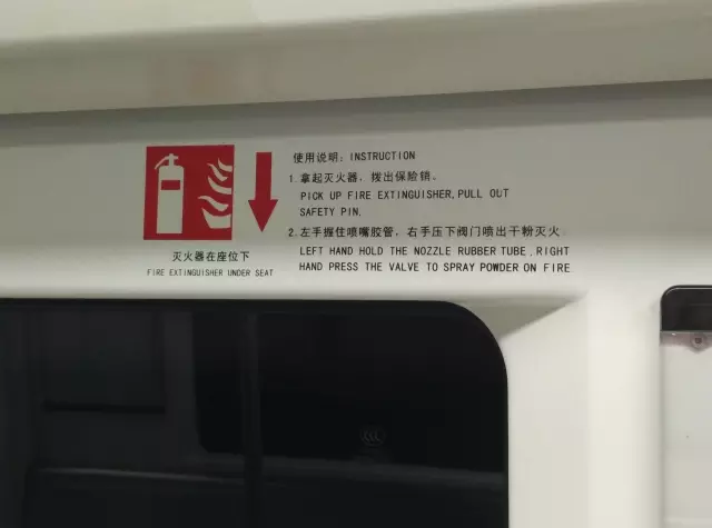 地鐵列車的滅火器布置于客室座椅下方,在其對應(yīng)的上方設(shè)有相應(yīng)的標(biāo)志。滅火器每個(gè)客室有2個(gè),其中在列車出現(xiàn)火情的情況下,乘客可自行取出滅火器,按要求對準(zhǔn)起火點(diǎn)進(jìn)行滅火。