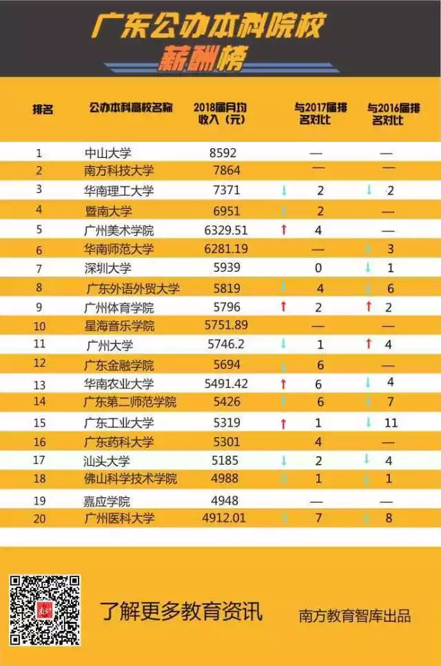 不久前,省教育廳發(fā)布了《2018年高校畢業(yè)生就業(yè)質(zhì)量年度報告》,全省本科畢業(yè)生平均月薪為4522元。已公布相關(guān)數(shù)據(jù)的51所本科高校中,有35所超過了全省本科畢業(yè)生的平均月薪,其中中山大學(xué)8592元、南方科技大學(xué)7864元、華南理工大學(xué)7371元名列前3位,均超過7000元。