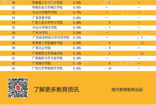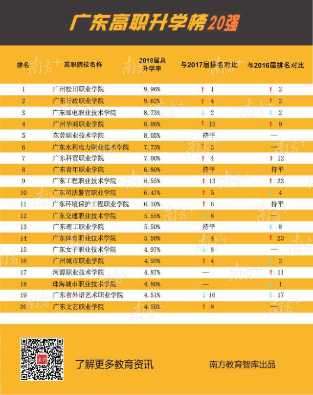 近3年各高職升學(xué)數(shù)據(jù)顯示,越來越多畢業(yè)生通過升學(xué)提升自身競爭力,尤其2018屆升學(xué)率增長明顯。其中有7所高職院校的畢業(yè)生升學(xué)率達到或超過7%,分別是廣州松田職業(yè)學(xué)院9.96%、廣東行政職業(yè)學(xué)院9.62%、廣東郵電職業(yè)技術(shù)學(xué)院8.73%、廣州華商職業(yè)學(xué)院8.06%、東莞職業(yè)技術(shù)學(xué)院8.05%、廣東水利電力職業(yè)技術(shù)學(xué)院7.73%和廣東科貿(mào)職業(yè)學(xué)院7.00%。