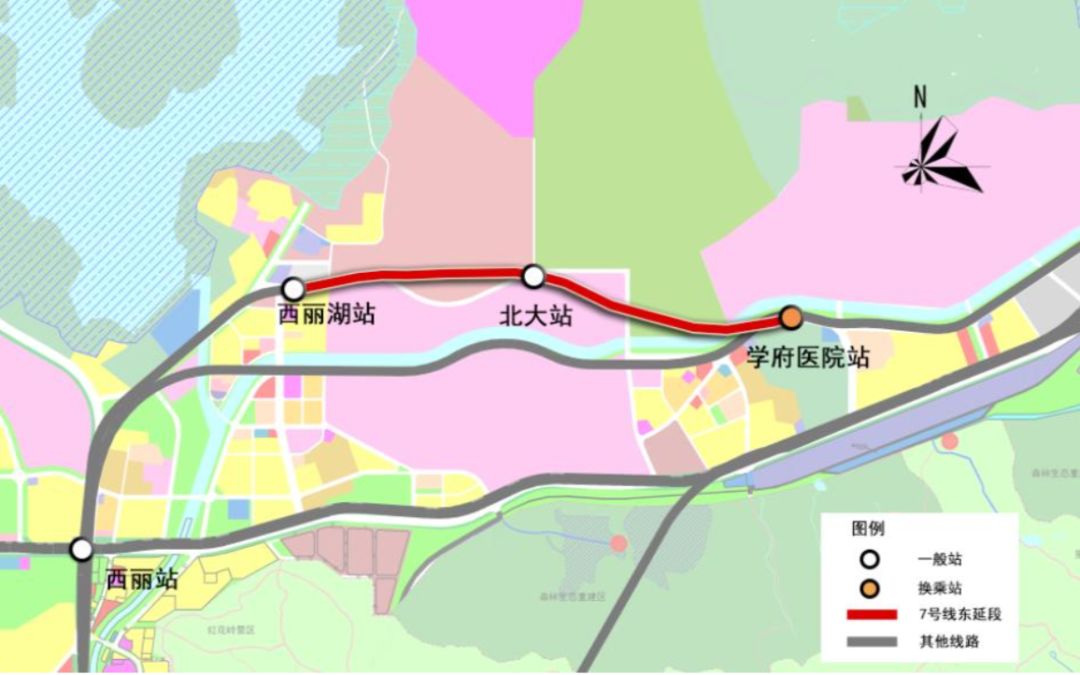 7號(hào)線東延起于既有7號(hào)線西麗湖站后,往東穿越深圳野生動(dòng)物園,進(jìn)入麗水路后于北大西門麗水路于西麗春園路交叉口處設(shè)置北大站,后穿過(guò)西麗高爾夫鄉(xiāng)村俱樂(lè)部與大沙河,于學(xué)苑大道與幽蘭路的交叉口設(shè)終點(diǎn)站學(xué)府醫(yī)院站。