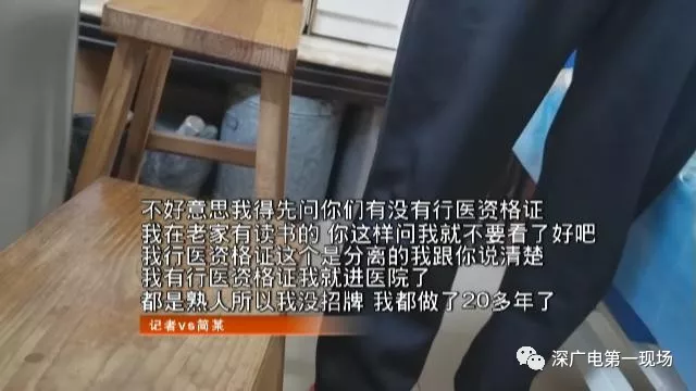 簡某嘴上說他有醫(yī)學(xué)院畢業(yè)證,但最后出示的是20多年前取得的,《廣州市社會(huì)力量辦各類校班結(jié)業(yè)證書》及《中醫(yī)醫(yī)療函授學(xué)習(xí)證書》,衛(wèi)監(jiān)人員說這都不算醫(yī)師執(zhí)業(yè)資格。對于沒有資格證的問題,簡某表示自己曾經(jīng)咨詢過,原來可以到湛江進(jìn)行考試,但現(xiàn)在已經(jīng)不行了。