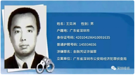 犯罪嫌疑人姓名:王見(jiàn)洲,男,1964年10月9日生,漢族,籍貫湖北省武漢市,戶籍地廣東省深圳市,身份證號(hào)碼:420104196410091635,普通護(hù)照號(hào)碼:145934656,原中國(guó)工商銀行深圳分行紅圍支行泥崗辦事處副主任。因涉嫌金融憑證詐騙罪于1998年12月潛逃出境。國(guó)際刑警組織于2016年11月14日對(duì)王見(jiàn)洲發(fā)布紅色通報(bào)。
