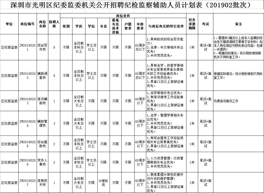 深圳市光明區(qū)紀(jì)委監(jiān)委機(jī)關(guān)公開招聘紀(jì)檢監(jiān)察輔助人員計劃表(201902批次)