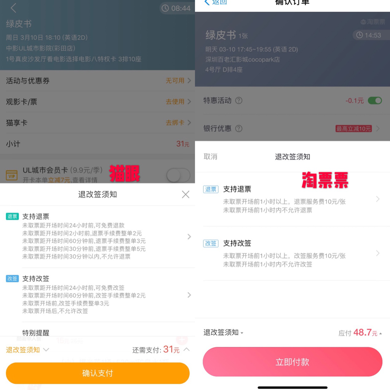 在淘票票APP上以及福田多家電影院,未取票開場前1小時以上,退改簽服務(wù)費10元/張,1小時以內(nèi)則不允許退改簽。使用電影兌換券、兌換碼、首映等特殊場次均不能辦理退改簽。