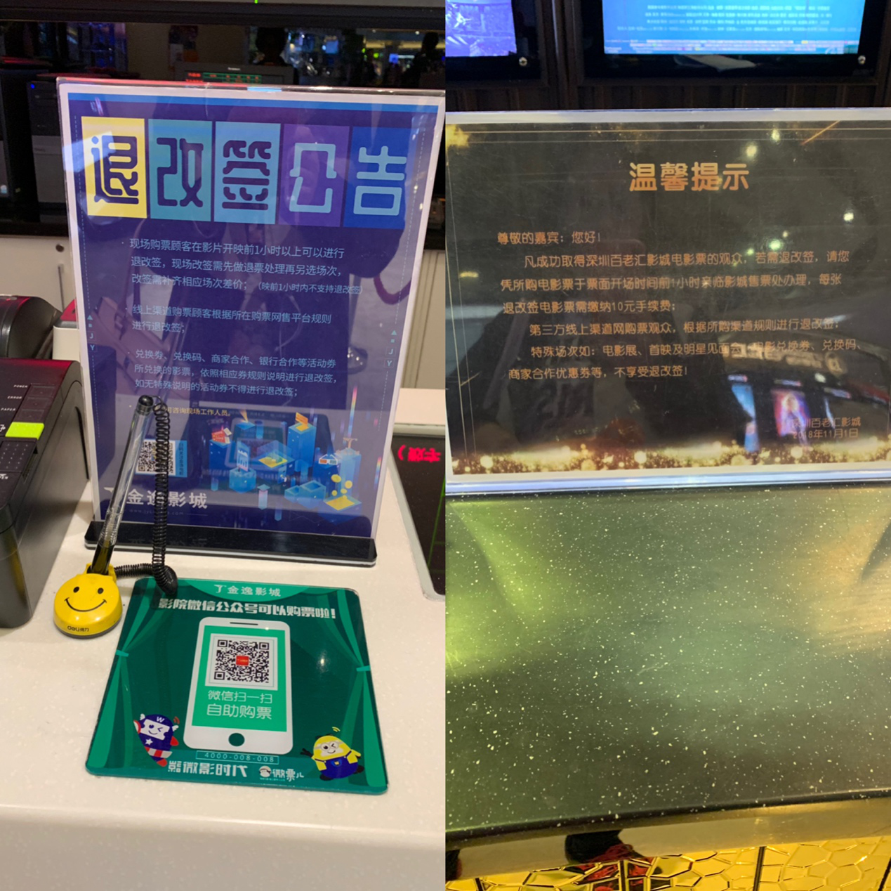線上支持“退改簽”的影院不多,那么線下電影院“退改簽”的情況怎么樣?記者昨日到福田中心城的多家影院了解情況?!霸谖覀兦芭_購買的電影票,在影片開映前1小時以上可進(jìn)行退改簽,但如果是在線上的售票渠道購買的電影票,我們不支持退改簽?!苯鹨萦俺侵行某堑赇N售員說。記者走訪發(fā)現(xiàn),福田多家影院的售票處均有“退改簽”的公告,注明不同購票渠道的不同退改簽流程,以及退改簽的時間和費用。